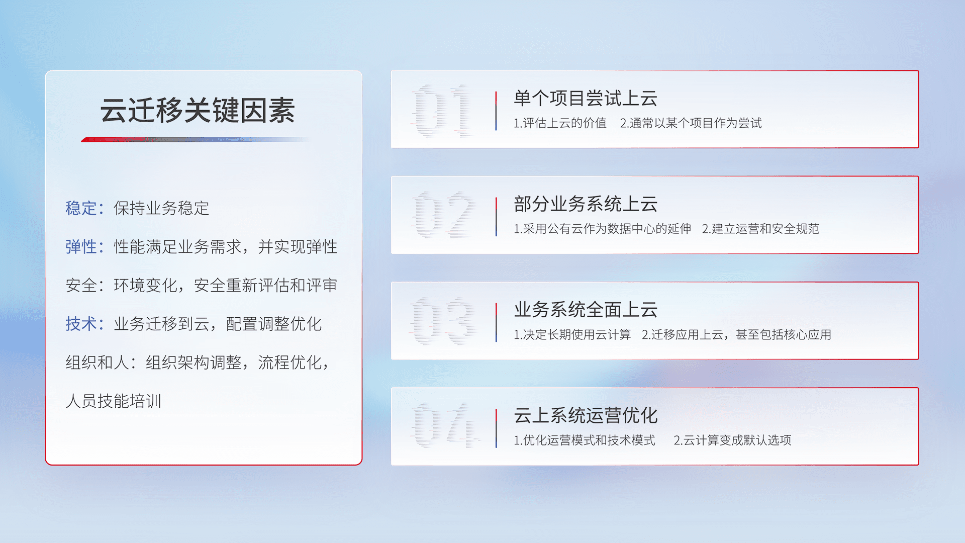 结合实际业务,,从规划设计、、、、云平台选型、、、云原生改造、、数据迁移、、、集成交付,,,,迁移全过程为客户识别最佳上云路径,,,做好风险识别管理,,设计网络架构、、、身份权限、、、安全审计合规、、操作审计、、、日志审计、、、、监控告警策略、、、、多站点容灾设计等,,,对云上基础设施进行整体规划,,提升IT治理水平,,以满足弹性、、高可用、、、高性能的需求。。。。