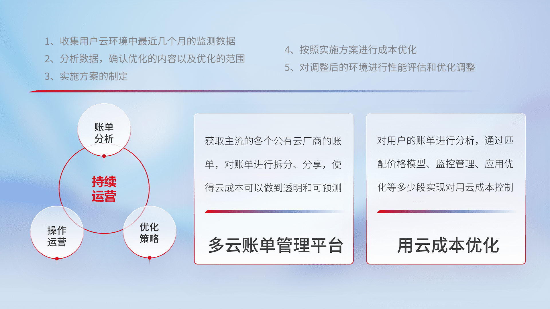 通过多云纳管,,,以统一的资源数据模型把客户的云资源进行抽象和封装,,,进而实现对多云资源的统一操作,,,保障云资源管理的可靠性、、稳定性与可用性。。。量身定制化运维内容,,配置、、、开发运维、、、补丁管理、、备份、、、监控、、认证和访问管理、、、审计和日常巡检等,,保障在用云过程中的可靠度,,稳定度以及高可用率。。。